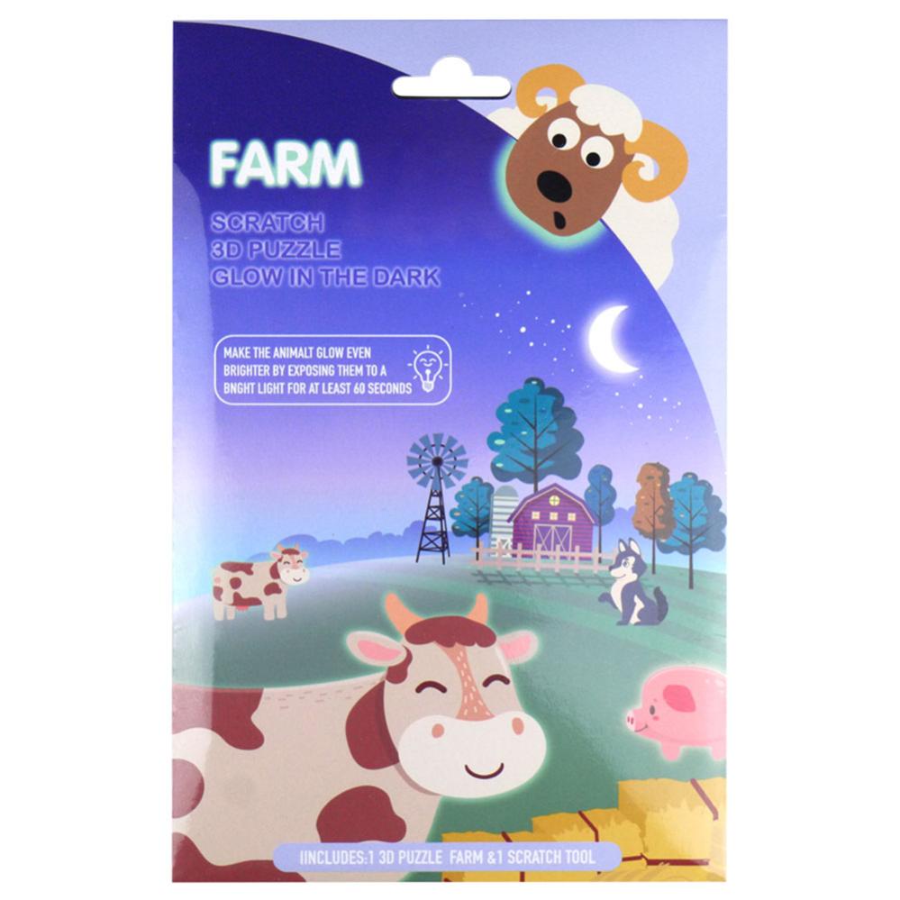 3D Raaputuspalapeli Maatilan Eläimet on raaputustehosteinen 3D-palapeli, mikä tarkoittaa, että raaputat ensin esiin palapelin palojen värit raaputusarvan tapaan. Sen jälkeen kokoat palat helposti pystyssä seisovaksi 3D-hahmoksi. Raaputusväline tulee mukana. Palapelistä on neljä erilaista maatilan eläintä esittävää vaihtoehtoa, ja se, minkä eläimen saat, on yllätys. Hahmo voi myös loistaa pimeässä, kun sitä altistetaan voimakkaalle valolle vähintään 60 sekunnin ajan.