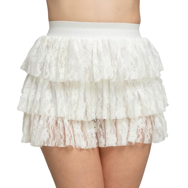 80-luvun Pitsihame Valkoinen sisältää lyhyen valkoisen pitsihameen, jossa on kolme röyhelökerrosta ja joustava vyötärö mukavaa istuvuutta varten.