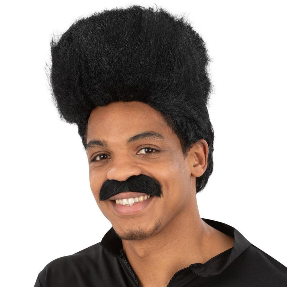 90-luvun Hiphop-peruukki Musta sisältää nostalgisen 90-luvun peruukin, jossa on pöyheä, korkea kampaus. Huom: viikset eivät sisälly.