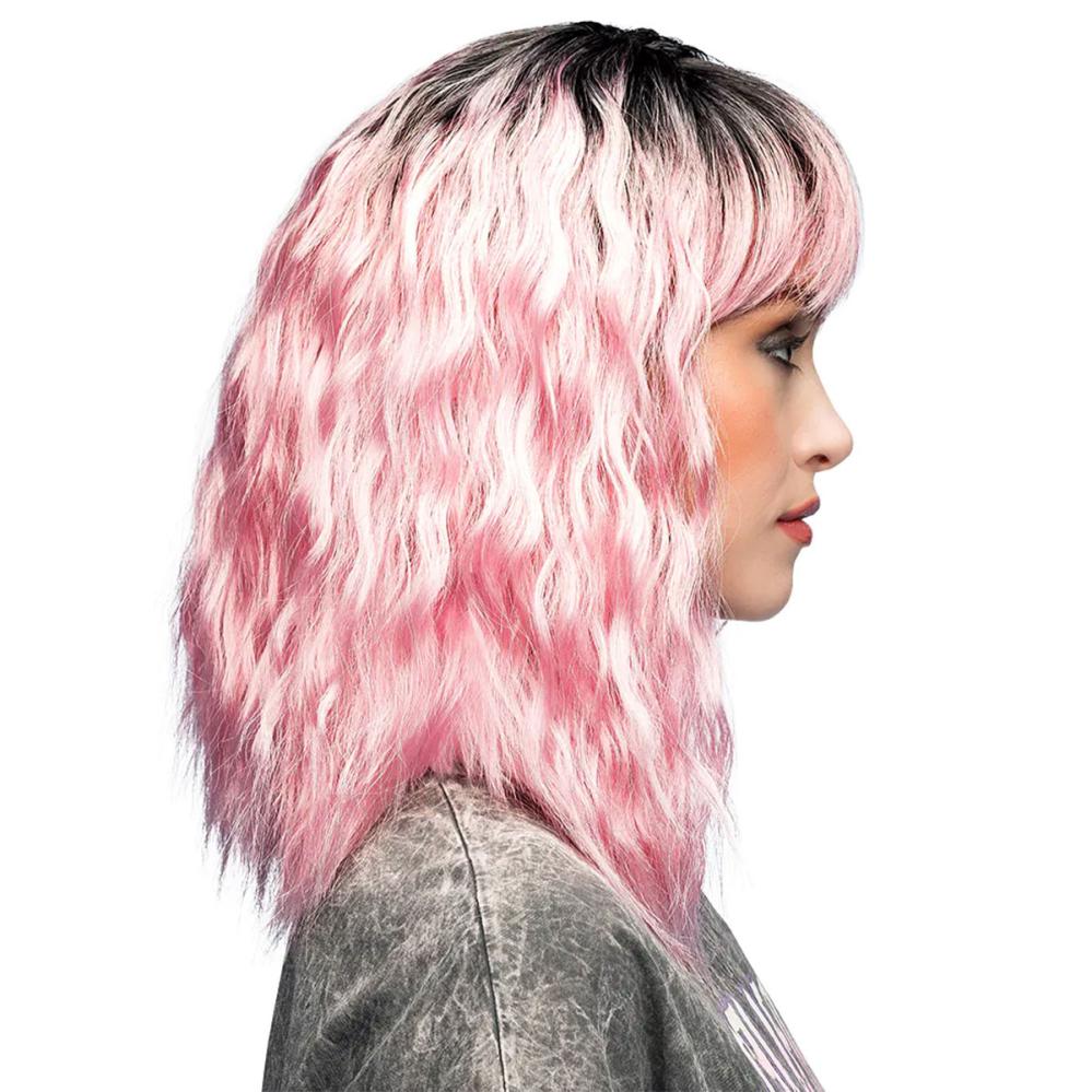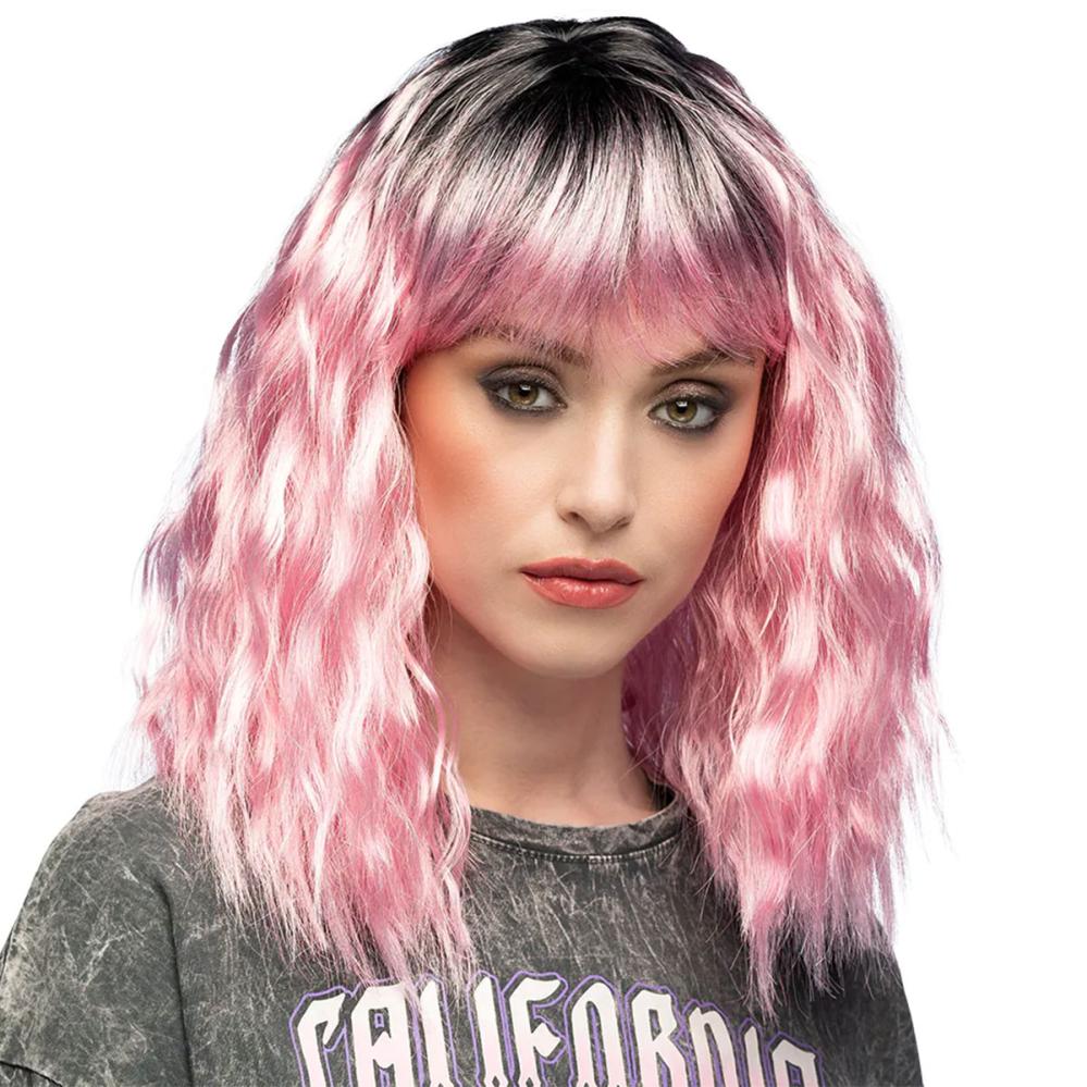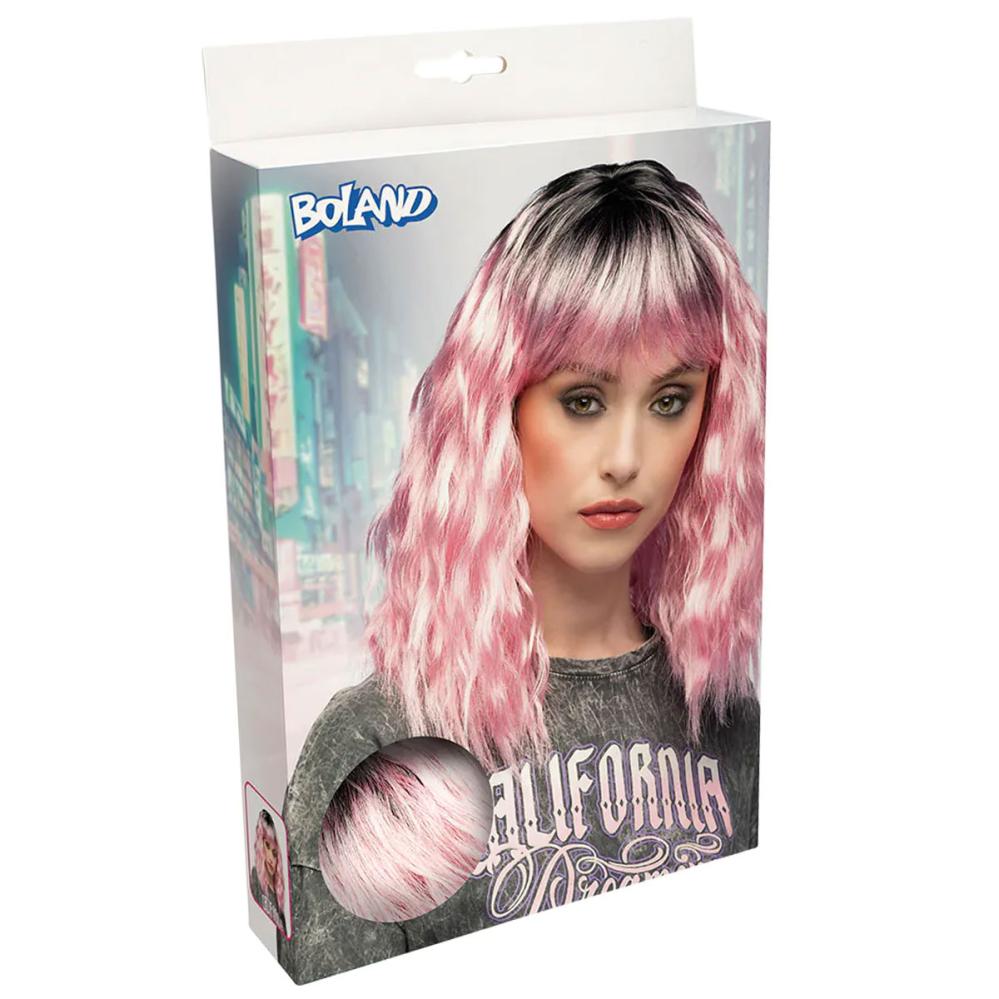 Aaltoileva Peruukki Vaaleanpunainen/Musta sisältää olkapäille ulottuvan peruukin, jossa on aaltoilevat hiukset ja otsatukka vaaleanpunaisena ja mustana.