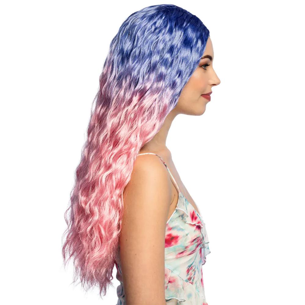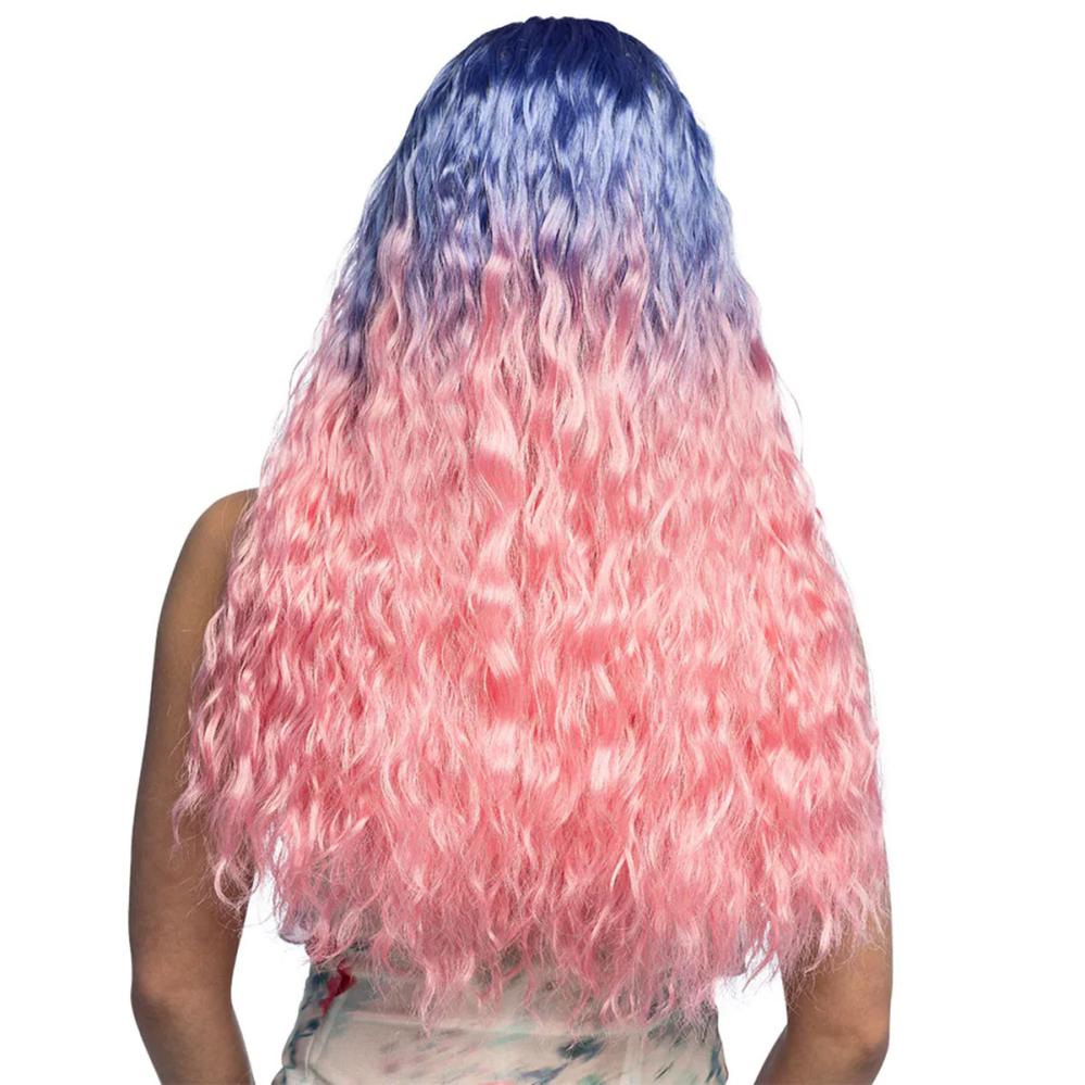 Pitkä peruukki on aaltoilevaa hiusta vaaleanpunaisissa ja sinisissä sävyissä, mikä antaa asuille leikkisän ilmeen naamiaisissa. Hiuksia voi harjata kevyesti ja peruukkia voi säätää helposti, jotta istuvuus on illan ajan tukeva.