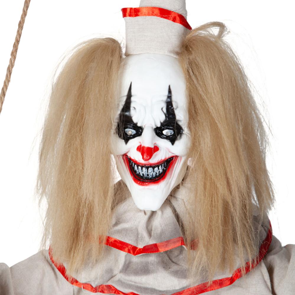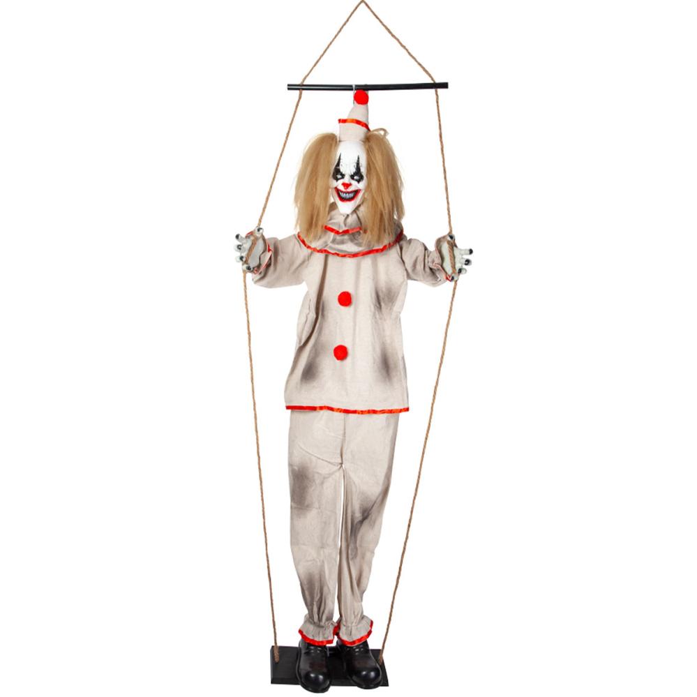 Animoitu Kauhupelle Keinussa 140 cm sisältää roikkuvan Halloween-rekvisiitan pelottavan klovnin muodossa, joka seisoo keinussa ja tuottaa ääntä ja valoa sekä liikkuu kosketettaessa. Klovnilla on valkoinen ja punainen hattu, yksityiskohtaiset kasvot ja vaaleat hiukset, ja sillä on valkoinen ja punainen asu, jota koristavat mustat läiskät. Aktivoinnin yhteydessä klovni alkaa täristä, sen silmät vilkkuvat punaisina ja se alkaa sanoa erilaisia lyhyitä lauseita englanniksi.