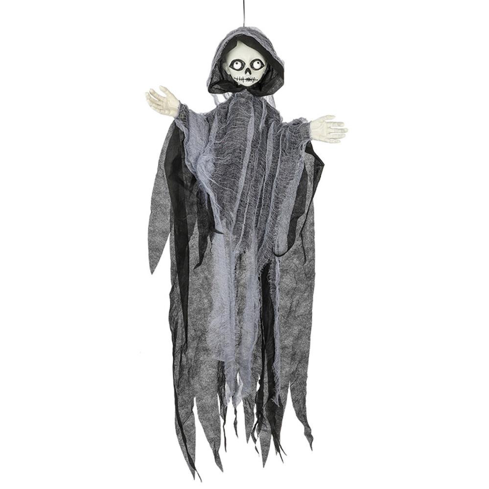 Animoitu Laulava Haamutyttö Rekvisiitta 110 cm on pelottava roikkuva haamutyttö, jossa on liike, valo ja ääni. Tällä paristokäyttöisellä halloweenhahmolla on meikatut kasvot, tuijottavat silmät ja mustavalkoinen, kulunut kaapu. Kun ääni aktivoi sen, sen silmät syttyvät, vartalo liikkuu ja se sekä puhuu että laulaa englanniksi.