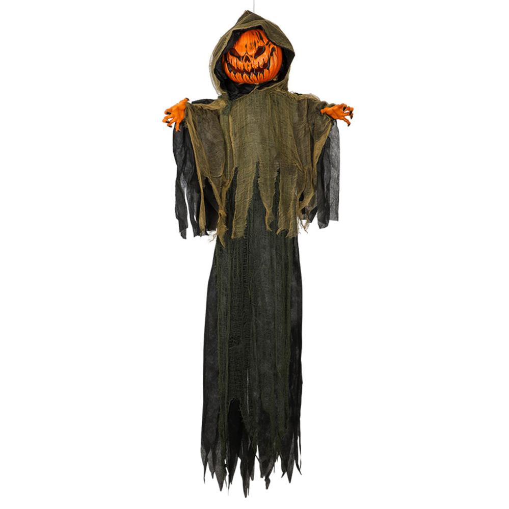 Animoitu Riippuva Kurpitsamies 200 cm sisältää roikkuvan halloween-koristeen kurpitsamiehen muodossa, jossa on valo, ääni ja liike. Hahmolla on ilkeä kurpitsairvistys, pitkä, vihreä ja repaleinen viitta sekä ojennetut kynnet. Aktivoinnin yhteydessä kasvot ja kädet valaistuvat samalla kun se toistaa karmivia äänitehosteita.