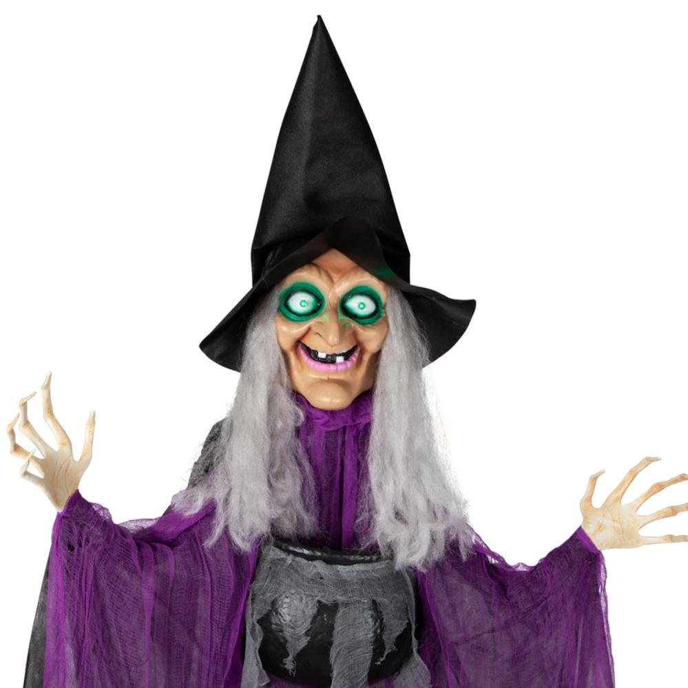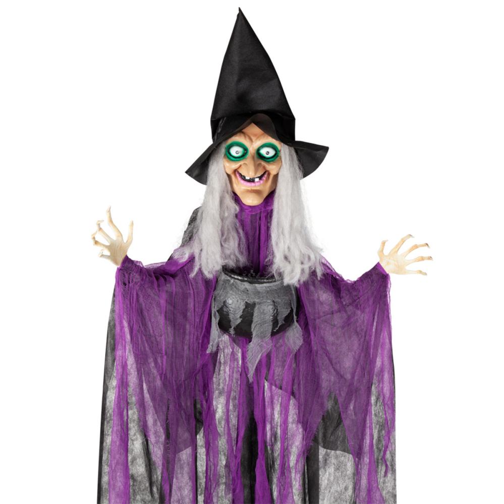 Animoitu Riippuva Noita 183 cm sisältää roikkuvan halloweenrekvisiitan, joka esittää noitaa, joka pitää ääntä, loistaa ja liikkuu. Noidalla on pieni pata, luurangonkaltaiset kädet, pitkät valkoiset hiukset, klassinen teräväkärkinen hattu ja rikkinäinen viitta violetin ja mustan sävyissä. Aktivoitaessa tämä karmiva noita herää eloon, sen vihreät silmät vilkkuvat, käsivarret liikkuvat ja se nauraa pahantahtoisesti.
