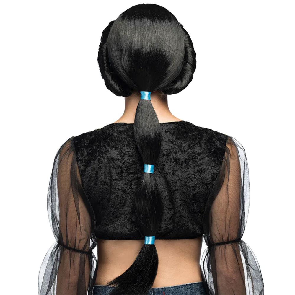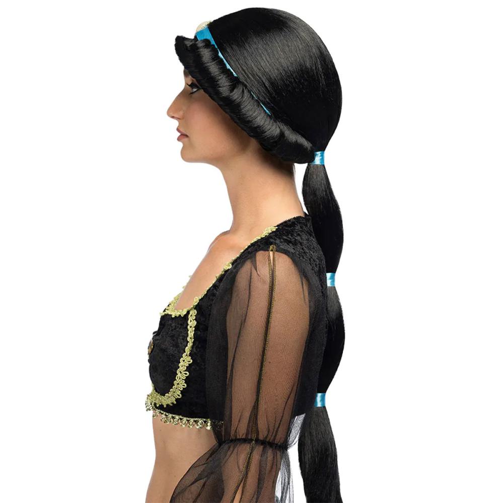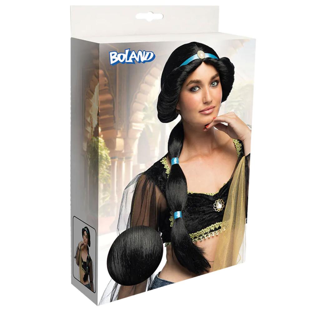 Arabialainen Prinsessa Peruukki sisältää pitkän, mustan peruukin, joka on tyypillinen Aladdin-elokuvan prinsessa Jasminen hiuksille. Peruukissa on siniset nauhat, jotka pitävät hiukset koossa, sekä kultainen yksityiskohta edessä.