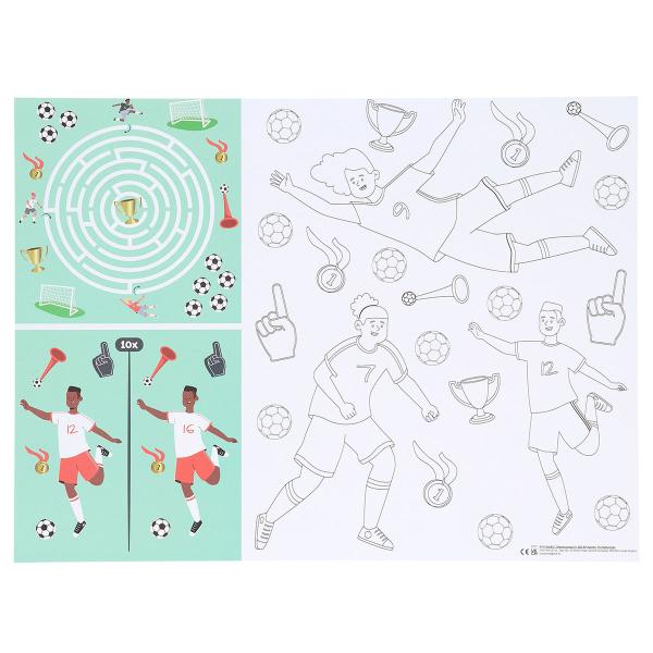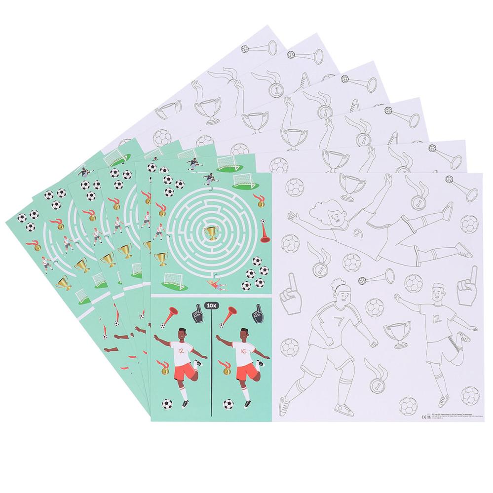 Askartelu- ja Värityspöytätabletit Jalkapallojuhlat 6 kpl sisältää kuusi paperista pöytätablettia jalkapalloteemalla, jokaisessa kolme hauskaa puuhatehtävää, labyrintti, joka johtaa kultapokaalille, "etsi kymmenen eroavaisuutta" ja suuri kuva väritettäväksi.