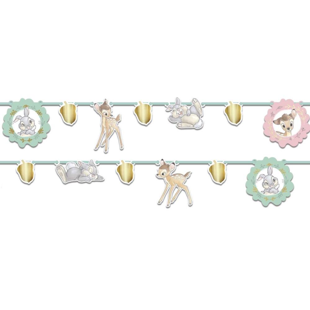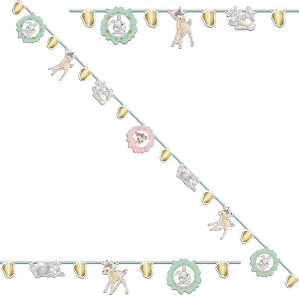 Bambi Garland sisältää söpön vihreän ja vaaleanpunaisen seppeleen, jossa on erilaisia Disney-hahmojen Bambin kuvioita. ja Stampe sekä hohtavat kultaiset tammenterhot. Pujota kuviot mukana tulevaan vihreään nauhaan ja ripusta seppele kattoon tai seinää vasten. Seppele on valmistettu pahvista.