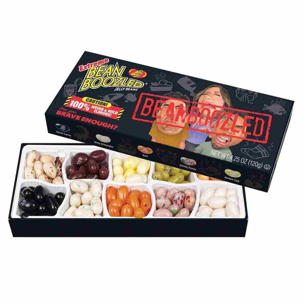 Bean Boozled Extreme Version sisältää laatikollisen hyytelöpapuja, joissa on sekä maukkaita että inhottavia makuja. Inhottavat maut on kuvattu pakkauksessa.