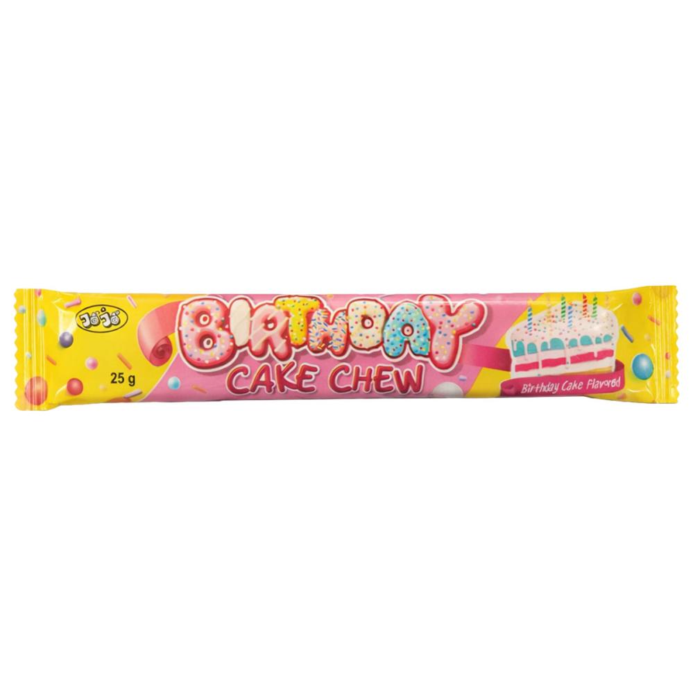 Birthday Cake Chew 25 g on pehmeä, pureskeltava karkkitanko, jonka maku on saanut inspiraationsa klassisen syntymäpäiväkakun tunnistettavasta mausta. Se on päällystetty pienillä, värikkäillä strösseleillä, jotka tuovat lisää iloa ja rakennetta.