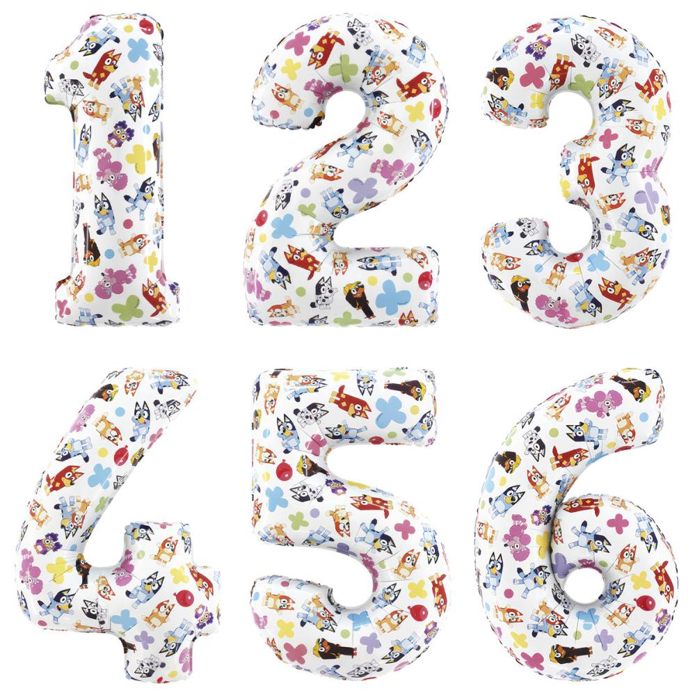 Bluey Numeroilmapallo sisältää valkoisen, numeron muotoisen foliopallon, jossa on värikkäitä Bluey-kuvioita. Pallo sulkeutuu itsestään ja sen voi täyttää joko ilmalla tai heliumilla.