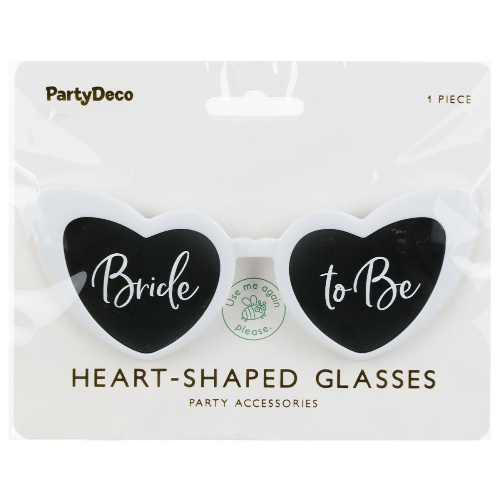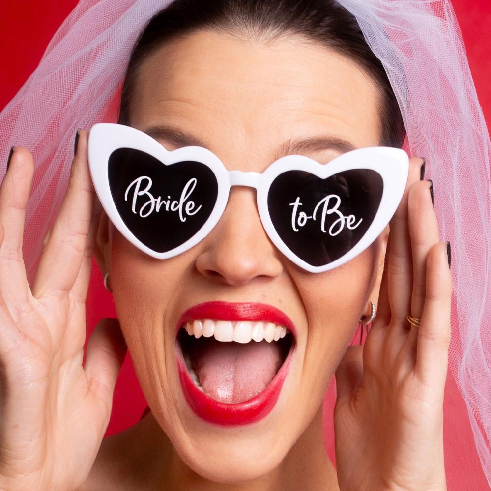 Bride to Be Sydämenmuotoiset Silmälasit ovat valkoiset, sydämenmuotoiset lasit, joissa on tummennetut linssit sekä tekstit 'Bride' ja 'to Be' valkoisella, yksi teksti kummassakin linssissä. Huomaa, että lasit eivät ole UV-suojatut!