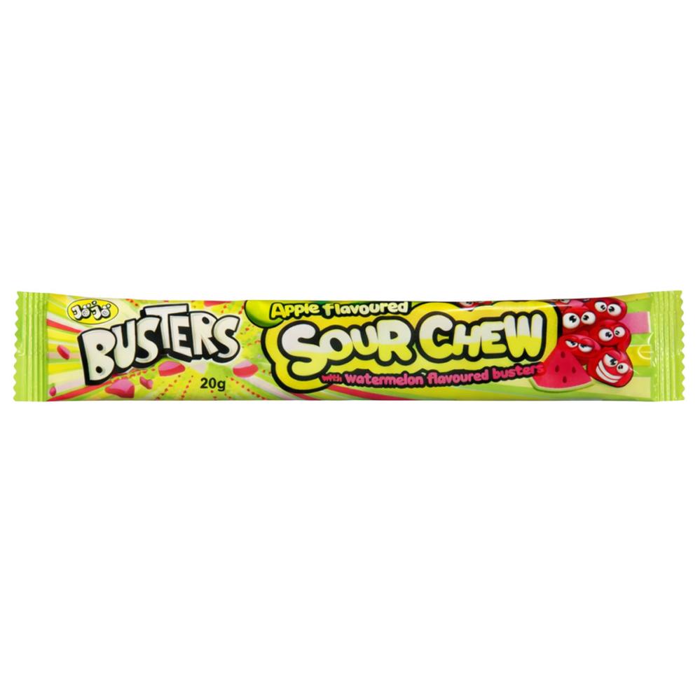 Busters Sour Chew Apple & Watermelon 20g on karkkipatukka, joka tarjoaa hapanta ja sitkeää hedelmäkarkkia. Happaman omenakarkin ja rapean vesimelonin yhdistelmästä syntyy ainutlaatuinen karkki, jossa on sekä omenan että vesimelonin maku.