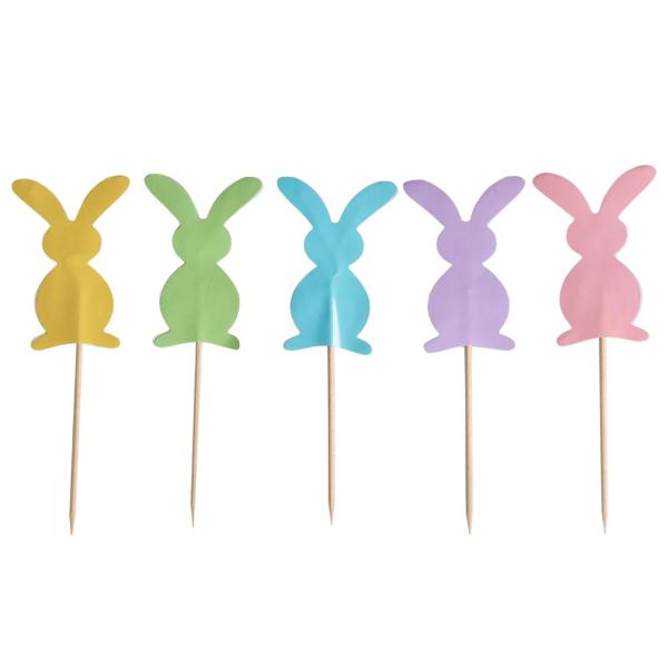 Cake Picks Pääsiäispupu 10 kpl sisältää kymmenen cake topperia, joissa on eri värisiä pääsiäispupuhahmoja.