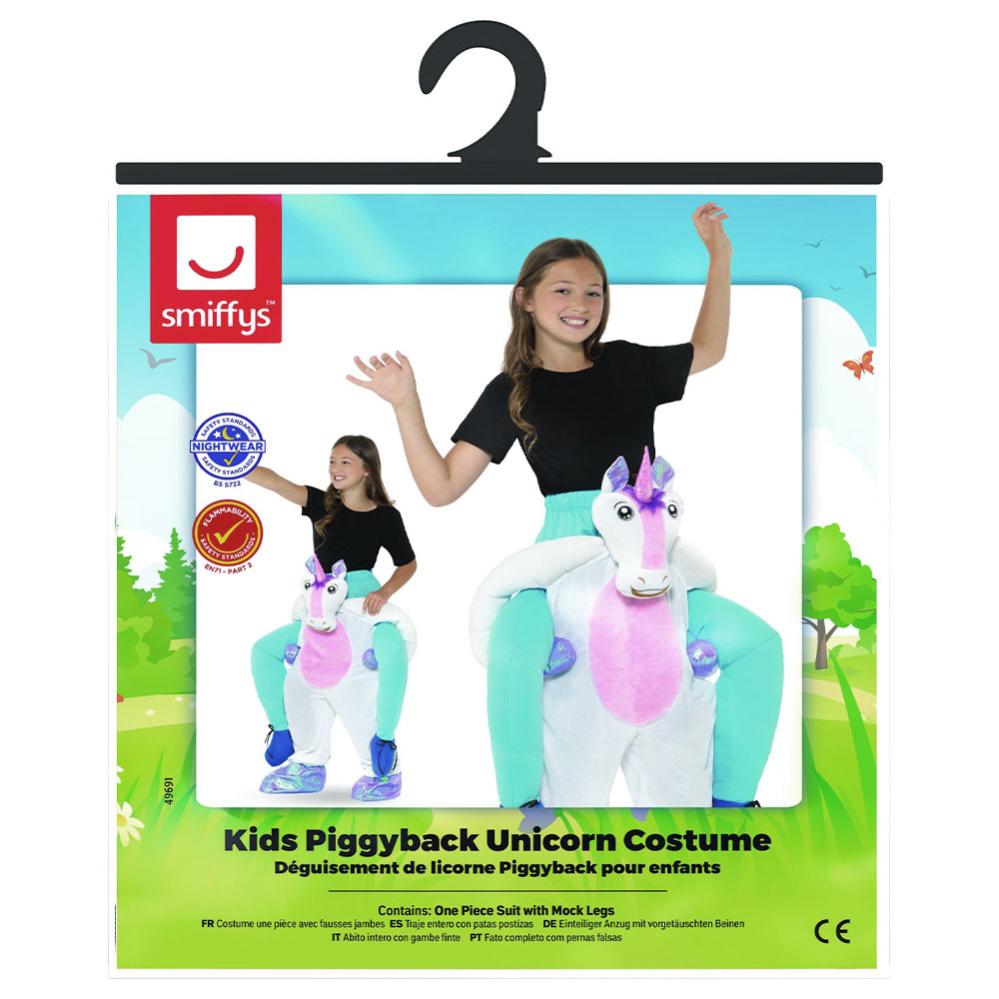 Carry Me Yksisarvisasu Lapsille sisältää reppuselkäasun valkoisen yksisarvisen muodossa, jossa on vaaleanpunaisia ja violetteja yksityiskohtia. Asussa on pari täytettyä vaaleansinistä jalkaa, jotka luovat illuusion siitä, että lapsi ratsastaa yksisarvisen olkapäillä. Se puetaan helposti kuin housut ja pysyy paikallaan vyötärön kuminauhalla. Sopii 7–9-vuotiaille lapsille. Housut ovat noin 85 cm pitkät.
