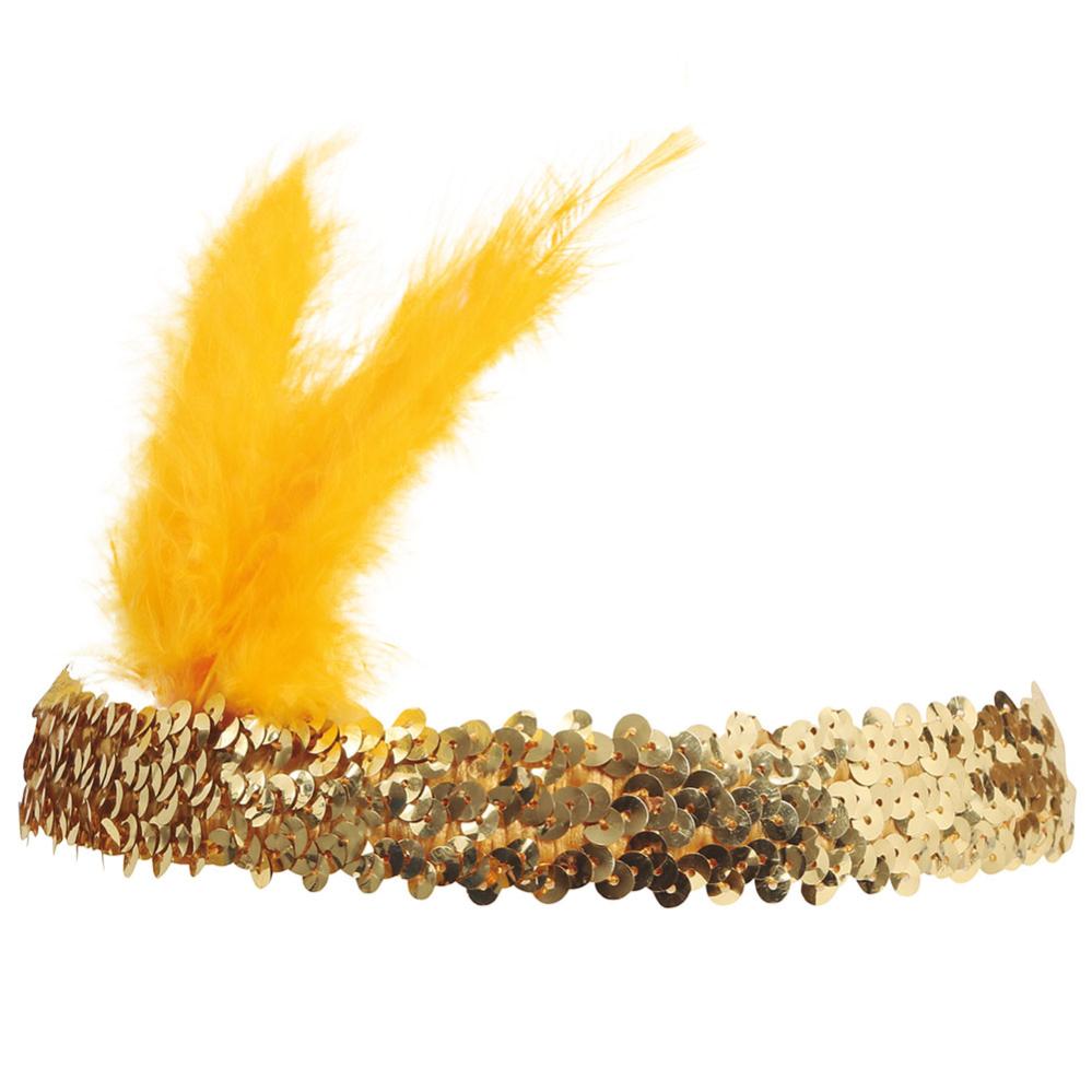Charleston Hiuspanta Höyhenilla Kulta sisältää joustavan hiuspannan, keltaiset höyhenet ja kullanväriset helmet.
