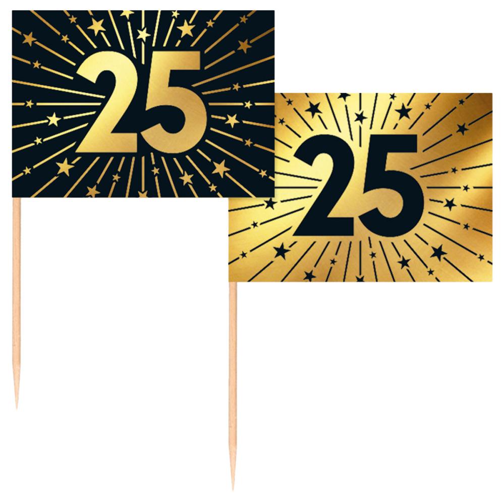 Juhli tyylillä koristeilla, jotka ovat cocktailtikkuja numerolla 25 kullan ja mustan sävyissä seuraavissa juhlissa. Nämä 50 eleganttia cocktailtikkua tuovat juhlaan ripauksen luksusta ja sopivat täydellisesti merkkipäivään tai syntymäpäivään, jossa numero 25 on keskiössä.