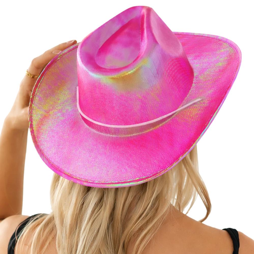 Cowboyhattu Irisoiva Pinkki sisältää pinkin westernhatun, joka hohtaa vihreän ja sinisen sävyissä valossa ja liikkeessä. Hatussa on valkoinen nauha, joka kiristetään leuan alle täydellisen istuvuuden takaamiseksi.
