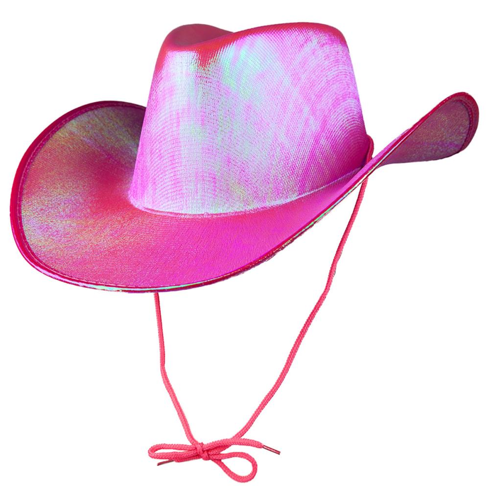 Cowboyhattu Kimaltava Vaaleanpunainen sisältää vaaleanpunaisen westernhatun, jossa on kimalteleva pinta, joka muuttuu valon ja liikkeen mukaan. Hattu toimitetaan nyörillä, joka kiristetään leuan alta täydellisen istuvuuden saamiseksi.