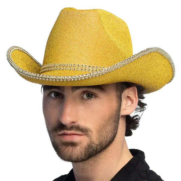 Cowboyhattu Kimalteleva Kulta sisältää kimaltelevan, kullanvärisen cowboyhatun, jossa on hopeanvärisiä strassikiviä.