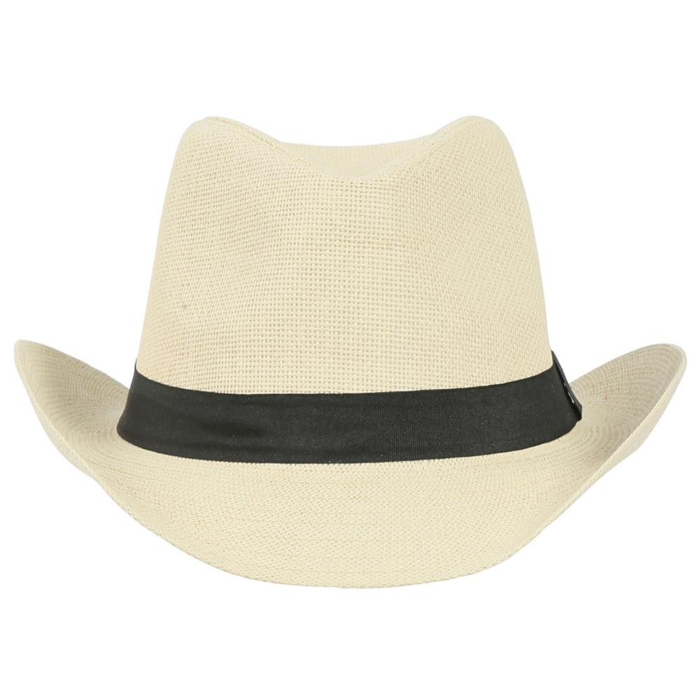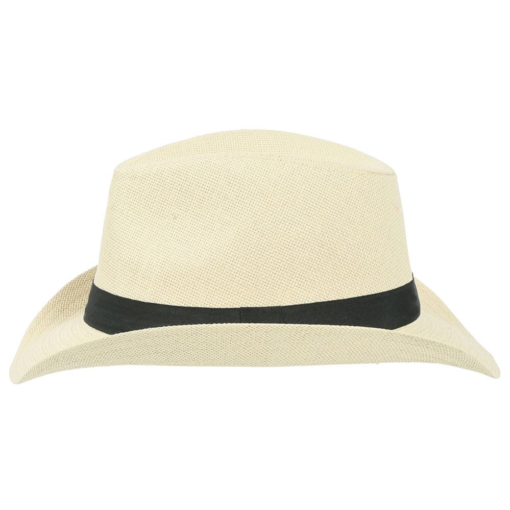 Cowboyhattu Vaaleanbeige sisältää vaaleanbeigen cowboyhatun, jota koristaa musta nauha ympäriinsä.