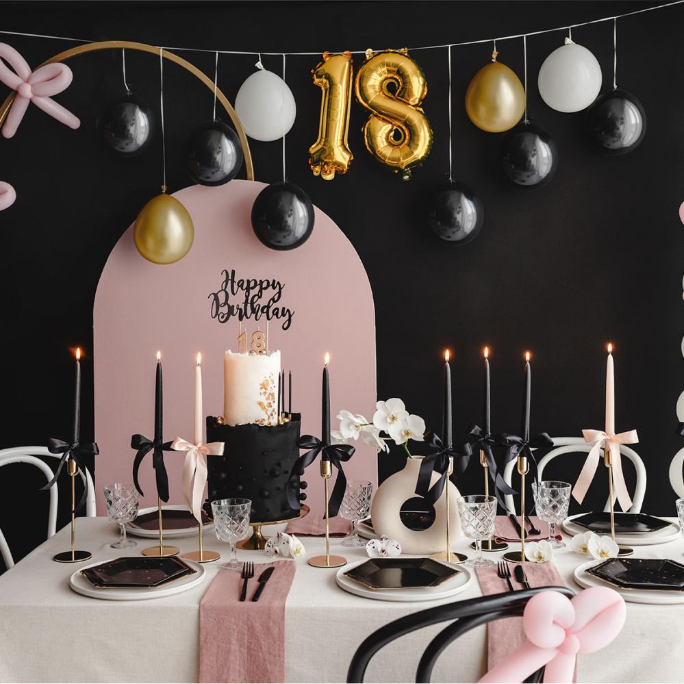 Nämä kaksi suurta kultaista numeropalloa tuovat syntymäpäiväkoristeluun näyttävyyttä ja nostattavat juhlatunnelmaa. Mustien ja kultaisten ilmapallojen avulla voit luoda kauniita köynnöksiä, jotka sopivat täydellisesti 18-vuotissyntymäpäivän koristeluun. Mukana tulevista syntymäpäiväilmapalloista saat muunneltavia ilmapalloköynnöksiä.