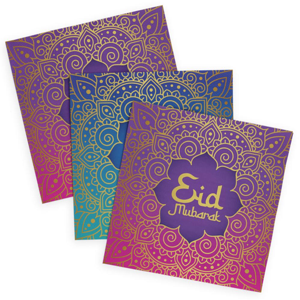 Eid Mubarak Servetit 20 kpl sisältää kaksikymmentä kolmikerroksista paperiservettiä lilan, vaaleanpunaisen, sinisen ja turkoosin sävyissä, koristeltuna kauniilla kuvioilla sekä mattakullanvärisellä tekstillä "Eid Mubarak".