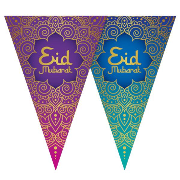 Tuo juhlaan väriä tällä Eid Mubarak koristeella viirinauhakoristeen muodossa. Lippuviirinauhassa on kaksipuoliset viirit hohtavissa väreissä, ja se voidaan ripustaa helposti täydelliseksi koristeeksi Eid Mubarak juhlaan.