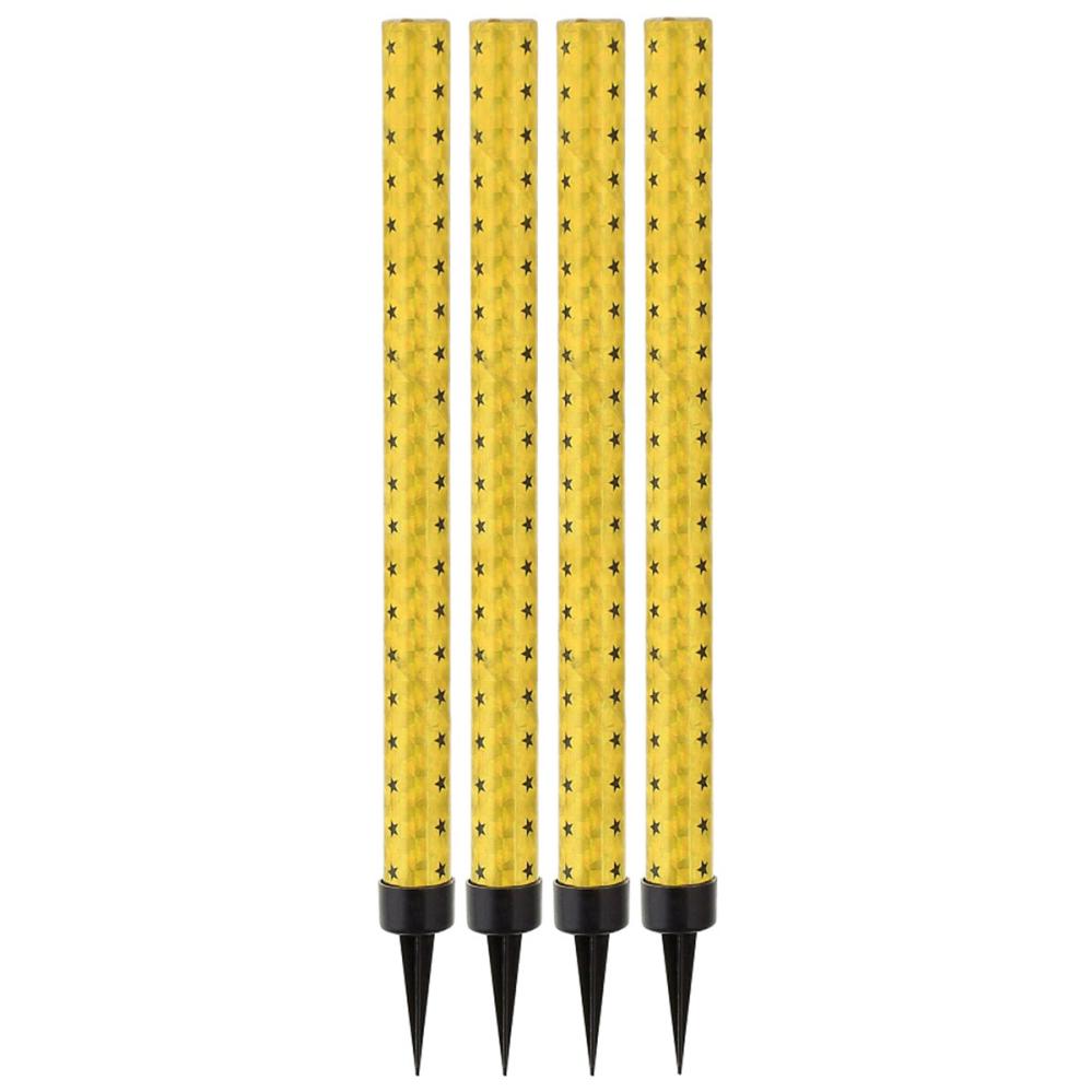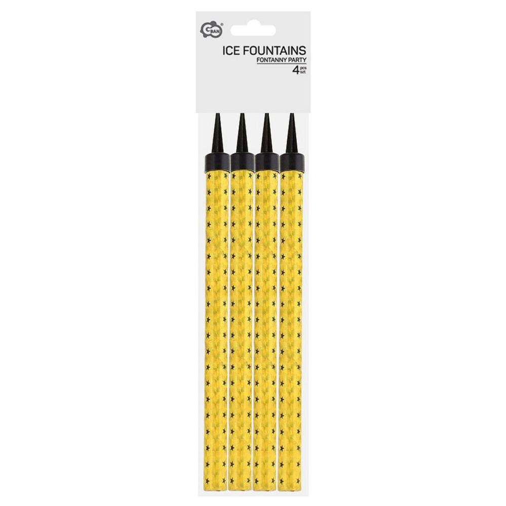 Erittäin Pitkät Jääsoihdut Kulta 4-kpl sisältää 4 kpl pitkiä jääsoihtuja holografisesti kimmeltävässä kullanvärissä, joissa on koristeellinen musta tähtikuvio. Jääsoihduissa on myös alhaalla musta muovikärki, jonka ansiosta ne on helppo työntää esimerkiksi kakkuun tai jälkiruokaan.