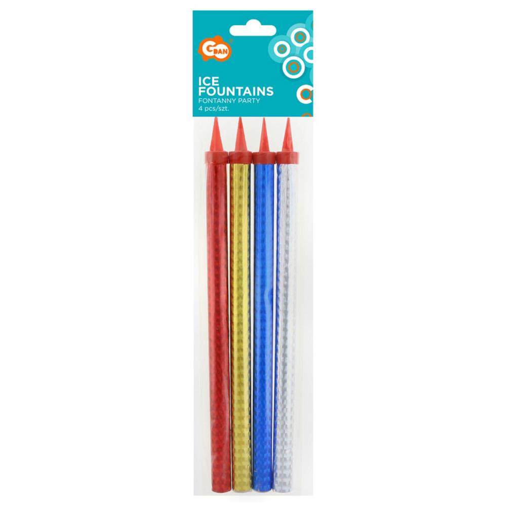Lisää väriä juhliin tällä kakkufontaanilla, joka on erittäin suurten jääsoihtujen muodossa. Punaisena, sinisenä, hopeisena ja kultaisena kimaltelevat jääsoihdut tekevät näyttävän vaikutuksen kakussa, jälkiruoassa tai ruoka-annoksessa.