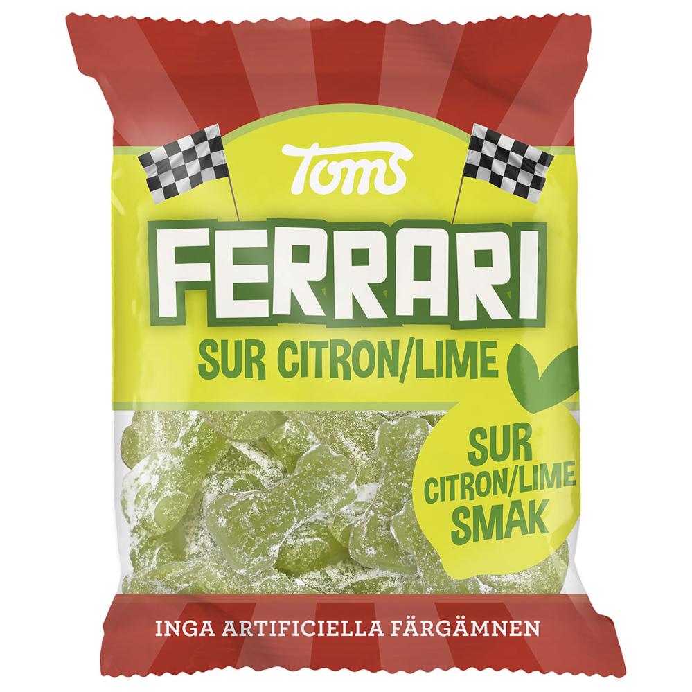 Ferrari Kirpeät Viinikumit 120g sisältää pussin, jossa on 30 kirpeää sitruunanmakuista viinikumia vihreiden Ferrari-autojen muodossa.