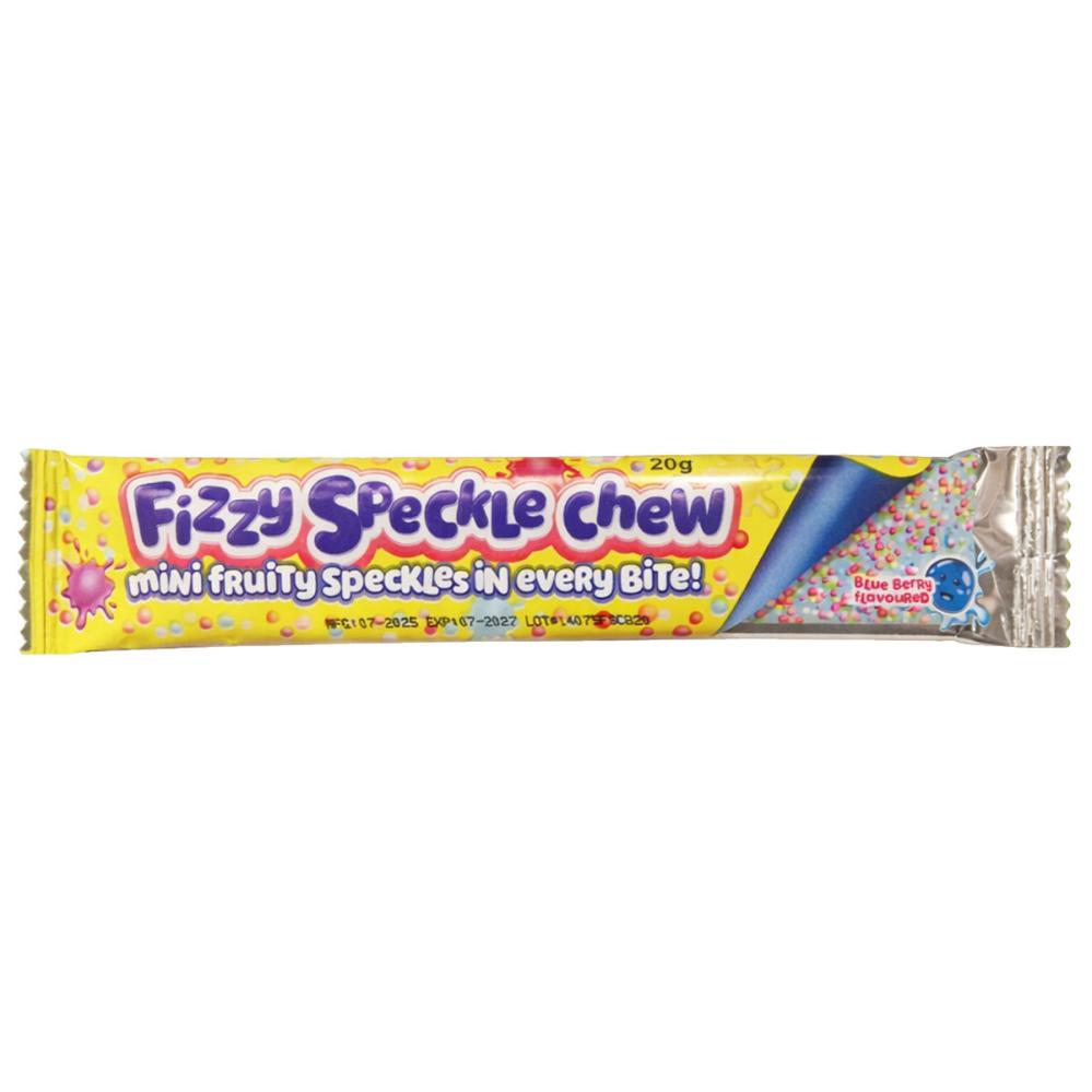 Fizzy Speckle Chew Blueberry on värikäs karkkipatukka, jossa on mustikan hedelmäinen maku ja rapeaa strösseliä. Se on hauska mustikkakarkki, joka tarjoaa sekä purutuntumaa että hedelmäistä makeutta jokaisella puraisulla.