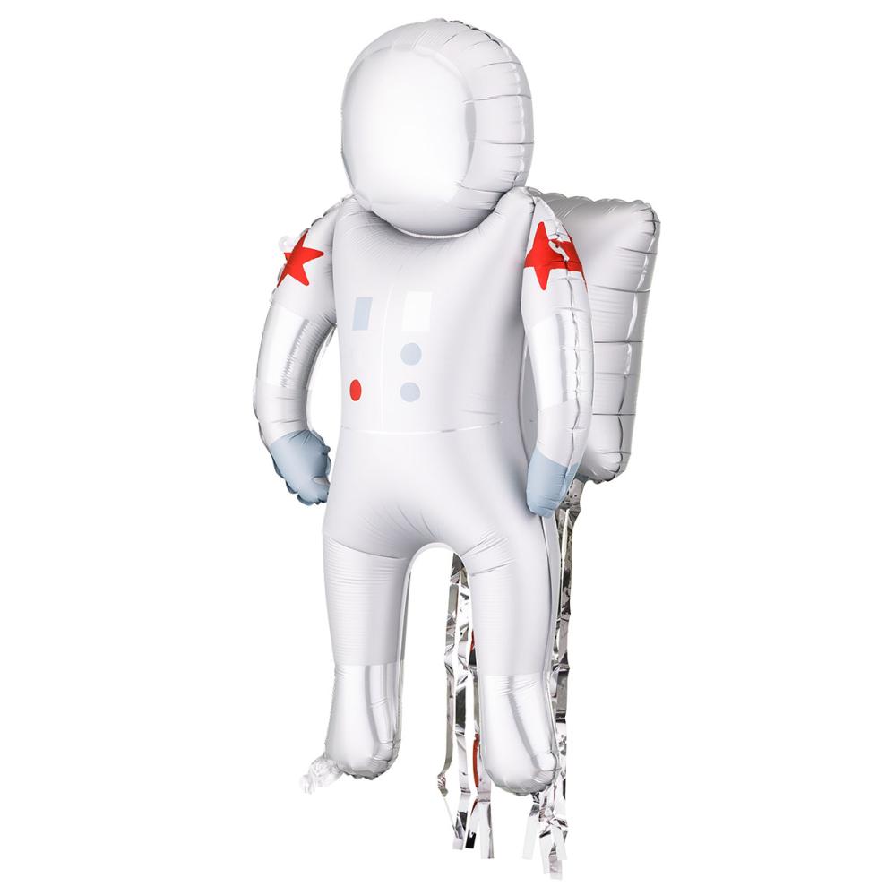 Folioilmapallo Astronautti 45 x 81 cm on astronautin muotoinen ilmapallo, jossa on valkoinen avaruuspuku ja punainen tähti molempien olkavarsien ympärillä. Astronautilla on selässään valkoinen paketti, josta roikkuu hopeanvärisiä folionauhoja. Ilmapallo täytetään ilmalla mukana tulevan puhallusputken avulla.