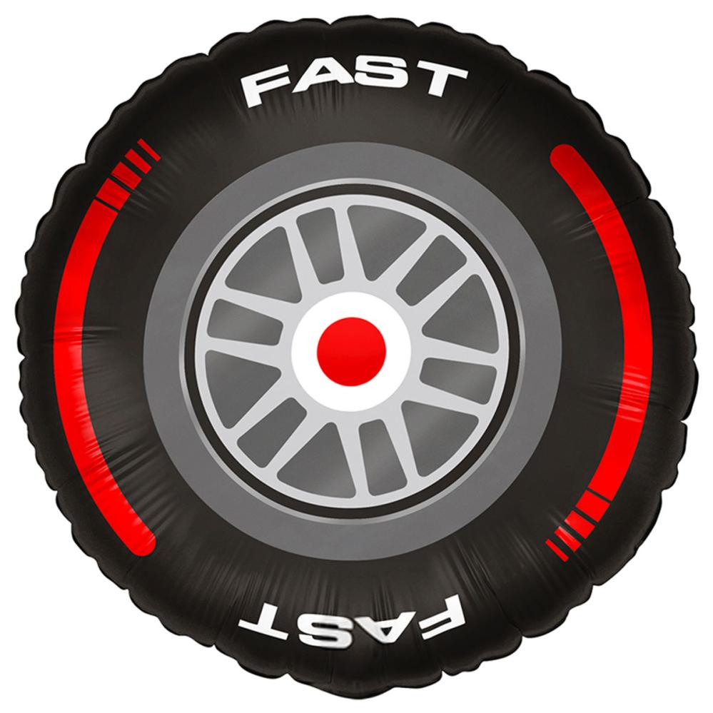 Folioilmapallo Autonrengas Racing 35 cm on pyöreä, musta folioilmapallo, jossa on racinghenkinen rengaskuvio, punaisia, harmaita ja valkoisia yksityiskohtia sekä teksti 'FAST' ylhäällä ja alhaalla.