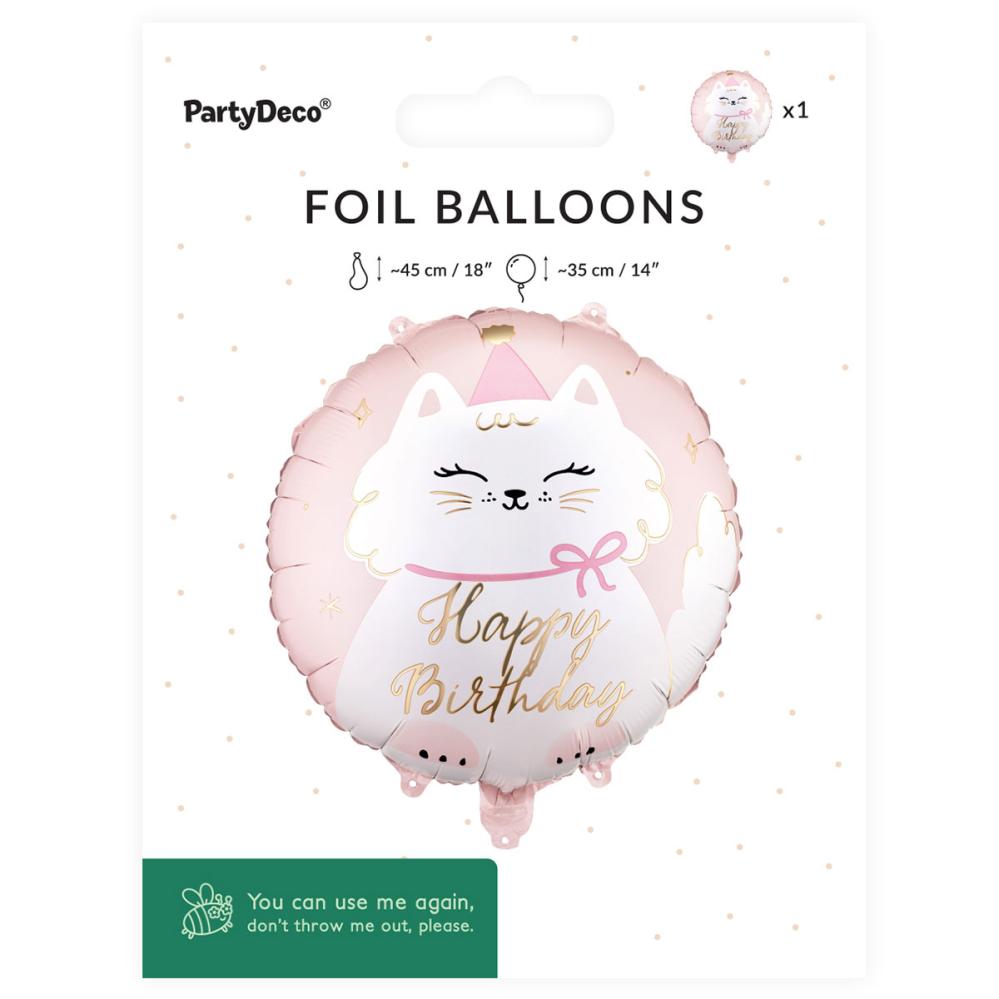 Folioilmapallo Happy Birthday Kissa 35 cm sisältää pyöreän, vaaleanpunaisen folioilmapallon, jossa on suloinen valkoinen kissa kultaisilla yksityiskohdilla ja vaaleanpunaisella juhlahatulla. Ilmapallo on myös koristeltu kultaisella tekstillä 'Happy Birthday'. Sen voi täyttää ilmalla tai heliumilla, ja sen mukana toimitetaan pilli täyttämistä varten.