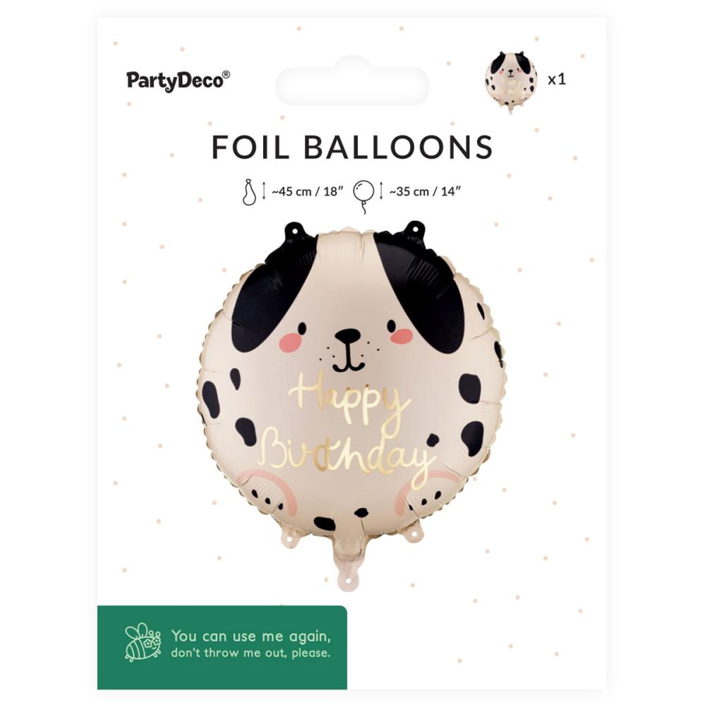 Folioilmapallo Happy Birthday Koira 35 cm sisältää pyöreän, kermanvärisen folioilmapallon, jossa on musta koira-aihe ja teksti ‘Happy Birthday’ hohtavan kullanvärisenä. Se voidaan täyttää ilmalla tai heliumilla, ja sen mukana toimitetaan pilli täyttämistä varten.