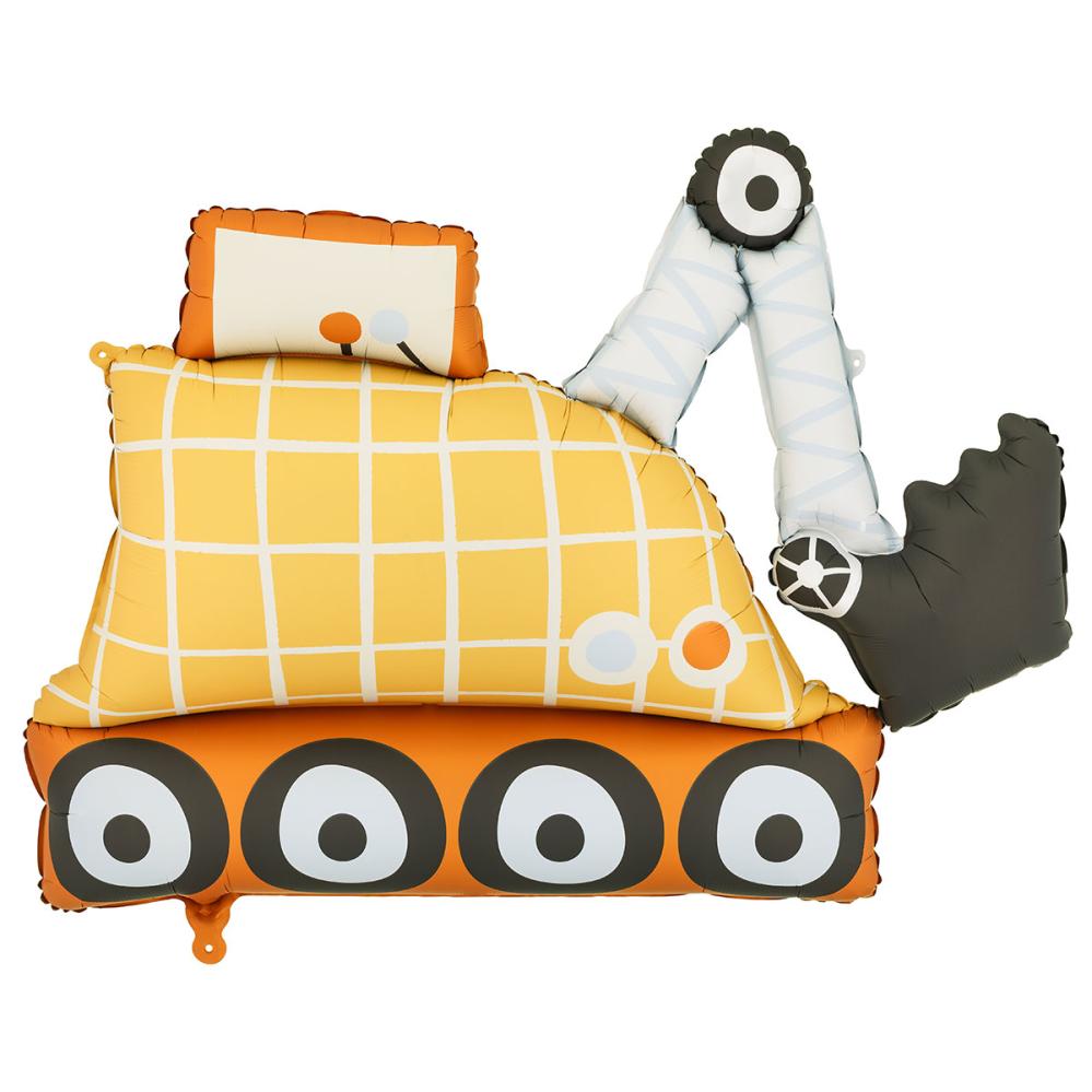 Folioilmapallo Kaivinkone 93 x 68 cm on ilmapallo, joka on keltaisen ruudullisen kaivinkoneen muotoinen. Siinä on oranssi yläosa ja alaosa sekä mustat renkaat. Kauha on musta ja kaulaosassa on vaaleansiniset kuviot. Ilmapallo täytetään ilmalla mukana tulevan pillin avulla tai heliumilla.