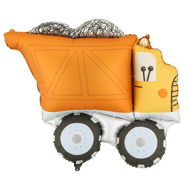 Folioilmapallo Kuorma-auto 87 x 69 cm on ilmapallo, joka on keltaisen kuorma-auton muotoinen, ja siinä on oranssi kuorma sekä mustat renkaat. Ilmapallo täytetään ilmalla mukana tulevan puhallusputken avulla tai heliumilla.