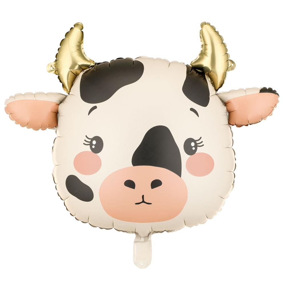 Folioilmapallo Lehmä 57 x 47 cm sisältää suloisen lehmän muotoisen folioilmapallon, jossa on pyöreät kasvot, kullanvärviset sarvet ja pehmeät kermanvalkoisen, mustan ja vaaleanpunaisen sävyt. Se voidaan täyttää ilmalla tai heliumilla, ja mukana toimitetaan pilli täyttämistä varten.