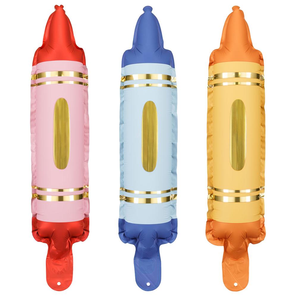 Tee lastenjuhlista erityisen värikkäät näillä liidun muotoisilla folioilmapalloilla. Settiin kuuluu kolme palloa sinisen, oranssin ja punaisen värisinä, kultaisin yksityiskohdin.