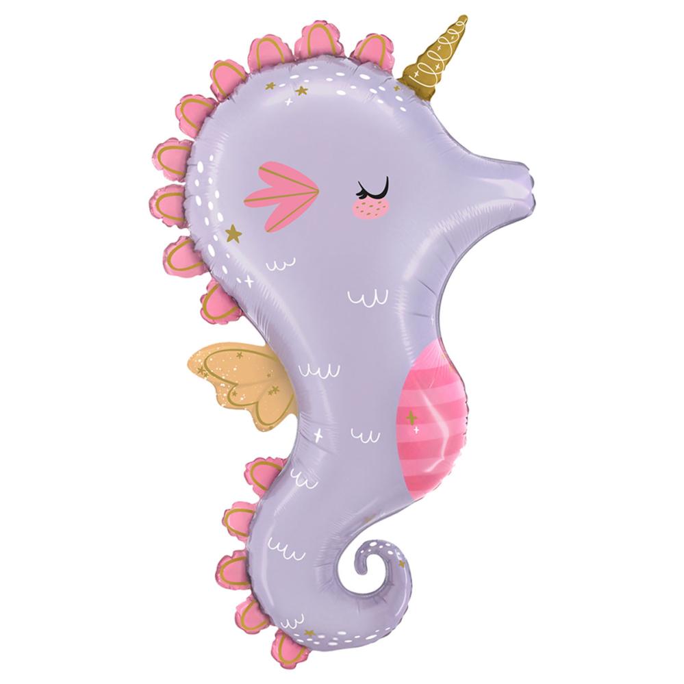 Maaginen merihevosemme folioilmapallona muuttaa jokaiset juhlat leikkisäksi seikkailuksi. Eläimen muotoinen hahmo liilan sävyissä, vaaleanpunaisilla yksityiskohdilla ja yksisarvisen sarvella on juhlien kohokohta eläinjuhlissa, satumaisissa merijuhlissa tai unenomaisen meriteeman juhlissa.
