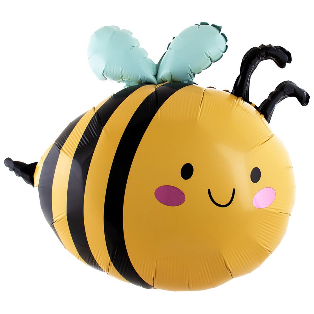 Folioilmapallo Mehiläinen 66 x 57 cm sisältää folioilmapallon, joka on iloisen keltaisen mehiläisen muotoinen ja jossa on vaaleansiniset siivet.