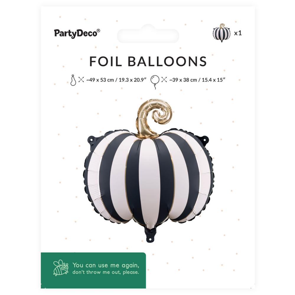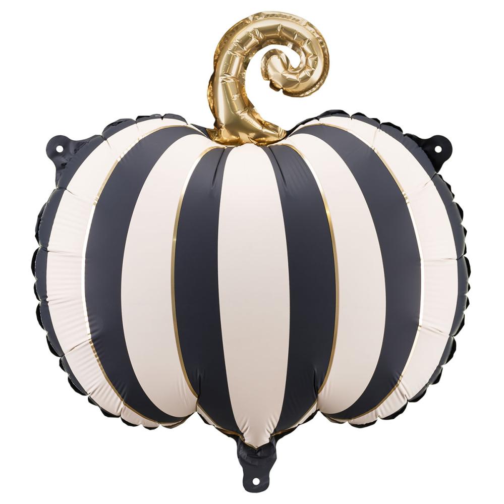 Folioilmapallo Raidallinen Kurpitsa Mustavalkoinen sisältää folioilmapallon, joka on raidallinen mustavalkoinen kurpitsa kullanvärisellä kannalla. Ilmapallon voi täyttää ilmalla mukana tulevalla puhallusputkella tai heliumilla.