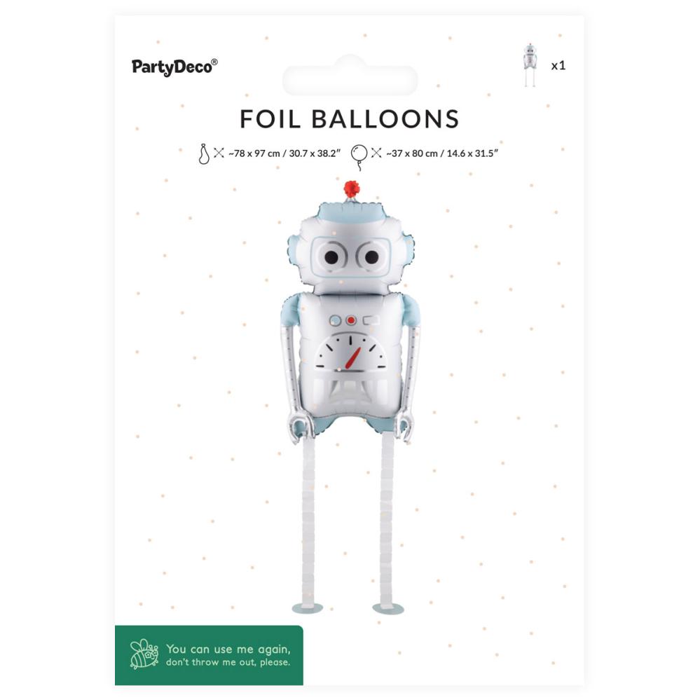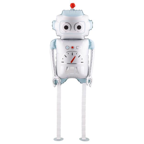 Folioilmapallo Robotti 37 x 80 cm on robotin muotoinen ilmapallo. Robotilla on suuret silmät mustilla pupilleilla, punainen sensori päässään ja pitkät kapeat jalat. Täytä ilmapallo heliumilla saadaksesi hauskan ’kävelevän’ efektin. Ilmapallon voi täyttää myös ilmalla mukana tulevan puhallusputken avulla.
