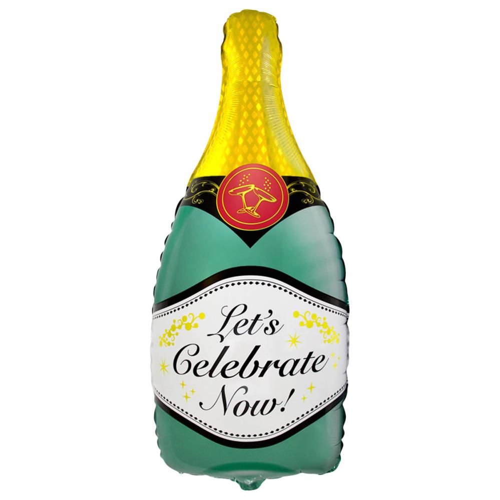 Folioilmapallo Samppanjapullo Let's Celebrate Now 83 cm sisältää foliopallon, joka on muotoiltu vihreäksi samppanjapulloksi. Pullossa on kullanvärinen yläosa, punaisia ja mustia yksityiskohtia sekä valkoinen etiketti, jossa teksti "Let's Celebrate Now!".