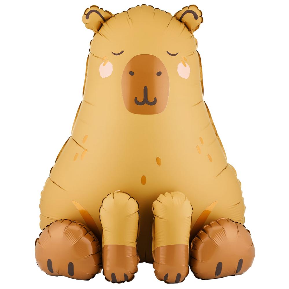 Folioilmapallo Seisova Kapybara 63 x 80 cm on istuvan kapybaran muotoinen ilmapallo. Kapybaralla on vaaleanruskea vartalo, tummanruskeat jalat ja vaaleanpunaiset posket. Ilmapallo täytetään vain ilmalla, ja se on helppo puhaltaa täyteen mukana tulevalla puhallusputkella tai ilmapallopumpulla nopeampaa täyttöä varten.