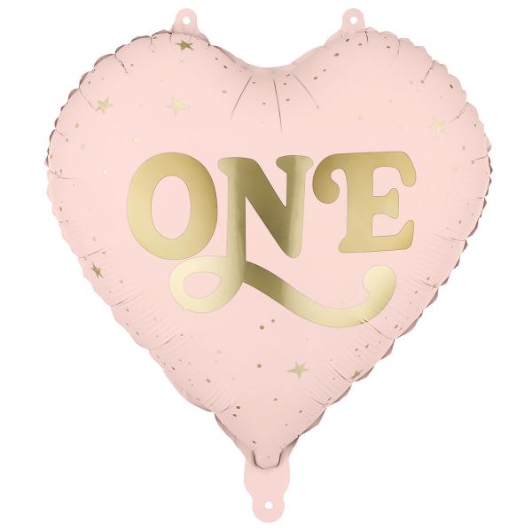 Folioilmapallo Sydän One Vaaleanpinkki sisältää vaaleanpunaisen, sydämenmuotoisen ilmapallon, jonka keskellä on sana 'ONE' tyylikkäällä kullanvärillä, ja jota reunustavat pienet pisteet ja tähdet ilmapallon reunaa pitkin kiiltävässä kultaviimeistelyssä. Se voidaan täyttää ilmalla tai heliumilla, ja mukana toimitetaan pilli täyttämistä varten.