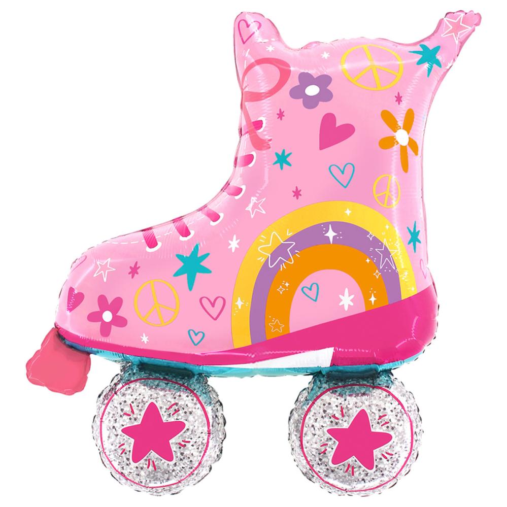 Folioilmapallo Vaaleanpunainen Rullaluistimet sisältää folioilmapallon, joka on vaaleanpunaisen rullaluistimen muotoinen. Rullaluistimessa on kukkien, rauhanmerkkien, sydämien ja monivärisen sateenkaaren kuvioita sekä hopeakimalteiset pyörät, joissa on tähti.