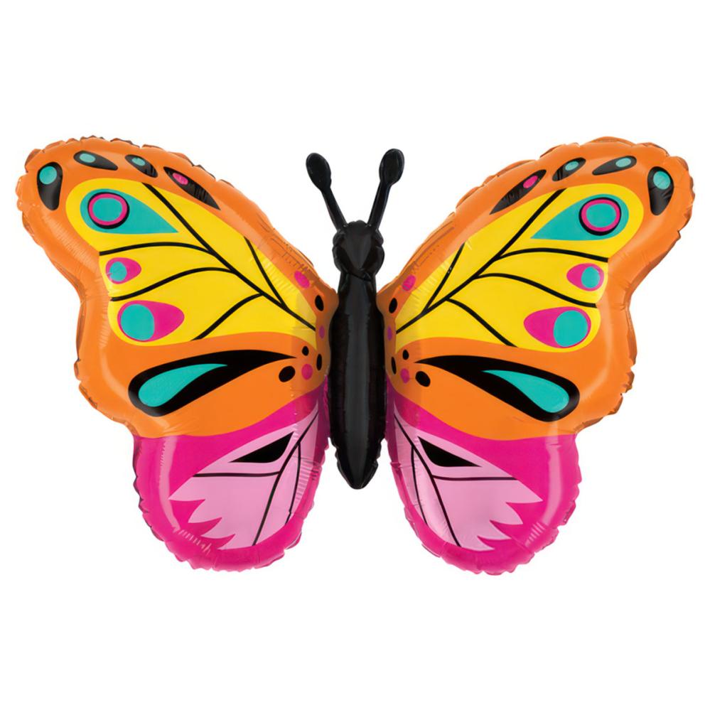 Folioilmapallo Värikäs Perhonen sisältää yhden perhosen muotoisen folioilmapallon, jossa on kauniit kuviolliset siivet väreissä oranssi, keltainen, turkoosi, musta ja vaaleanpunainen.