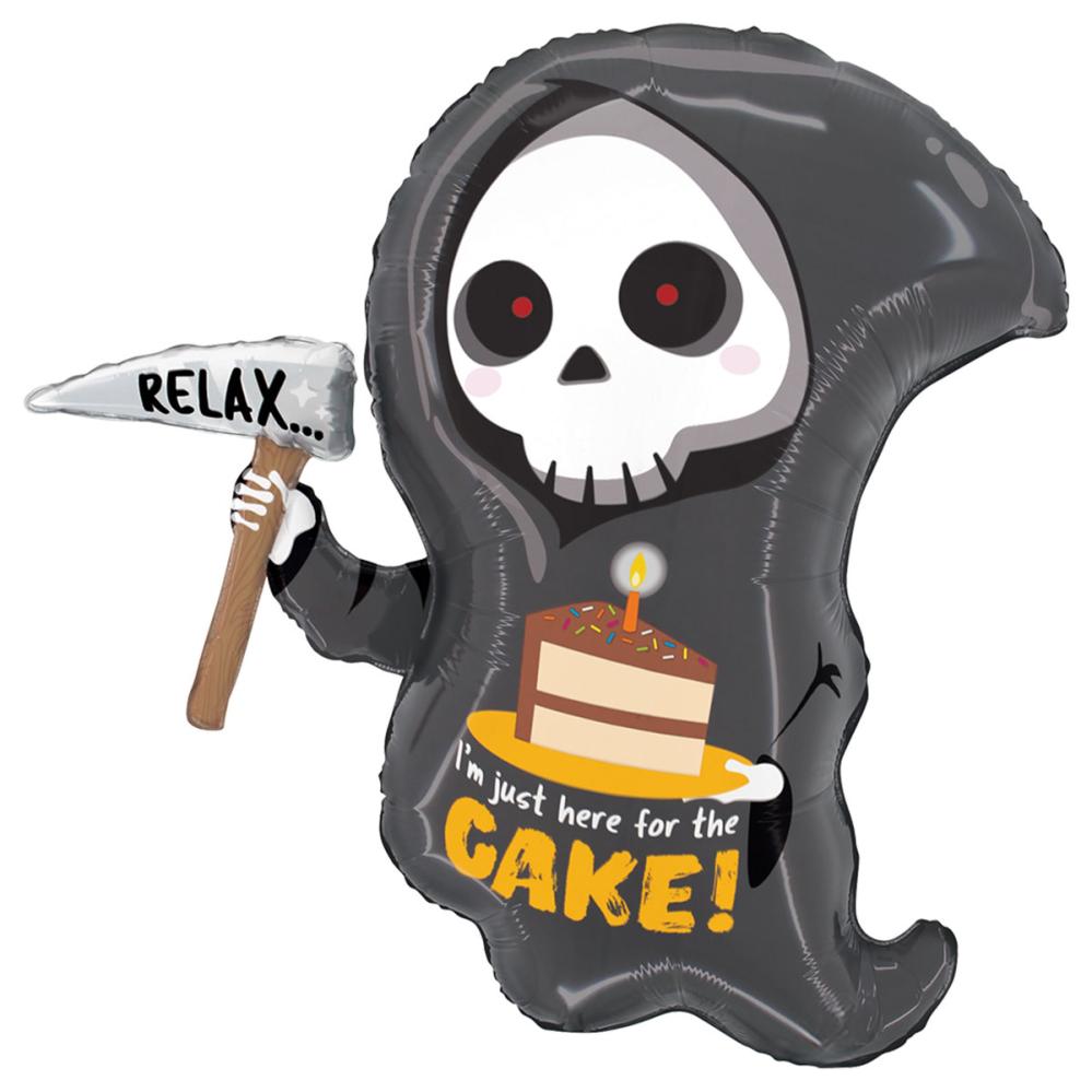 Folioilmapallo Viikatemies sisältää folioilmapallon viikatemiehen muodossa, joka pitelee lautasta, jossa on kynttilällä varustettu kakkupala. Viikatteessa lukee teksti "RELAX..." ja kakkupalan alla lukee "I'm just here for the CAKE!".